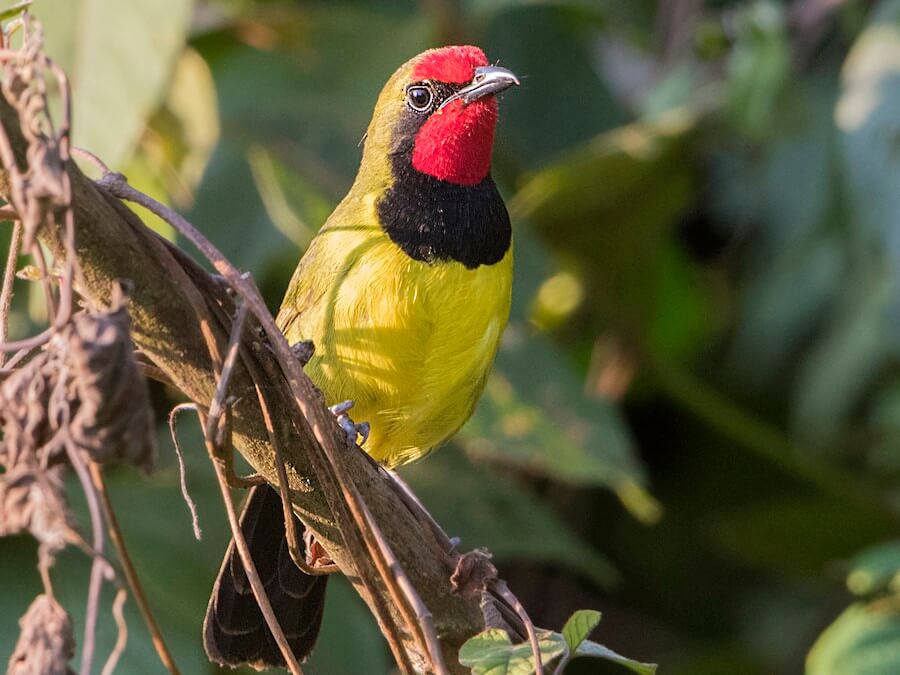 The Doherty’s Bushshrike, recognizable by its vibrant red forehead and throat, bright yellow belly, and distinctive black chest band, inhabits Uganda’s montane forests and dense underbrush. It’s a skulking species, more often heard than seen, which puts it on the list of the rarest and most sought-after birds around the globe